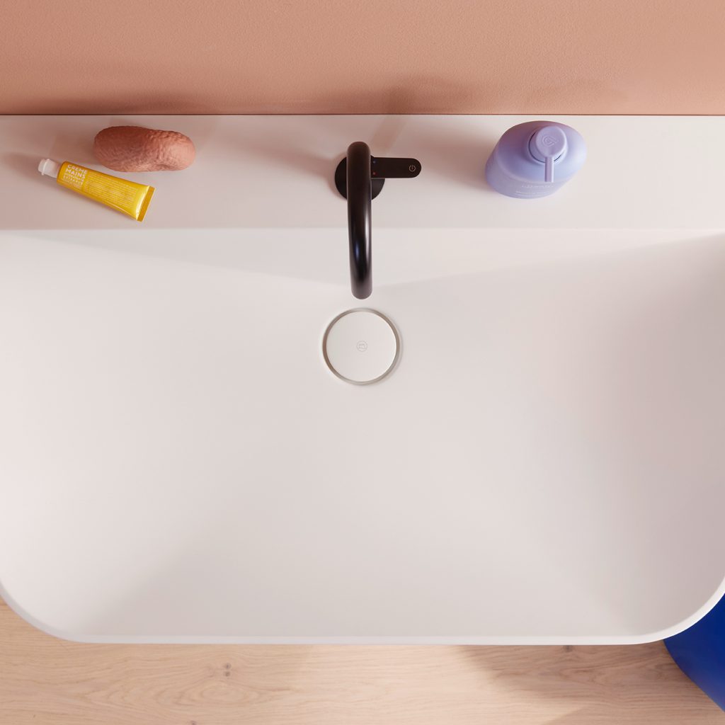 In erster Linie ist b:me aber durch den architektonischen Charakter und eine fast klassische Eleganz definiert. Schon der Waschtisch selbst kombiniert organische Formen mit geometrischer Klarheit. Die spitz auf den Ablauf zulaufenden Kanten bilden einen spannungsvollen Kontrast zur soft ausgeformten Beckenmulde. „Formal haben wir uns dem Mineralguss-Waschtisch über die Ästhetik eines nur partiell gefalteten Papiers genähert, dessen scharfe Kanten in weiche Rundungen übergehen“, verrät Designer Marcel Besau. „Die Form wird vor allem durch Licht und Schatten moduliert und verbindet die weichen und gewölbten Flächen von Sanddünen mit einer klaren Kantenführung.“