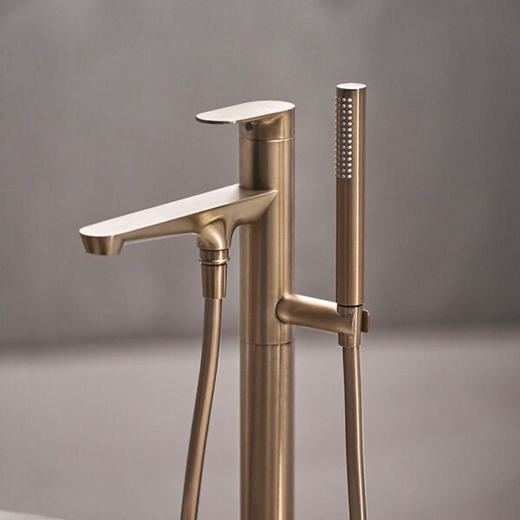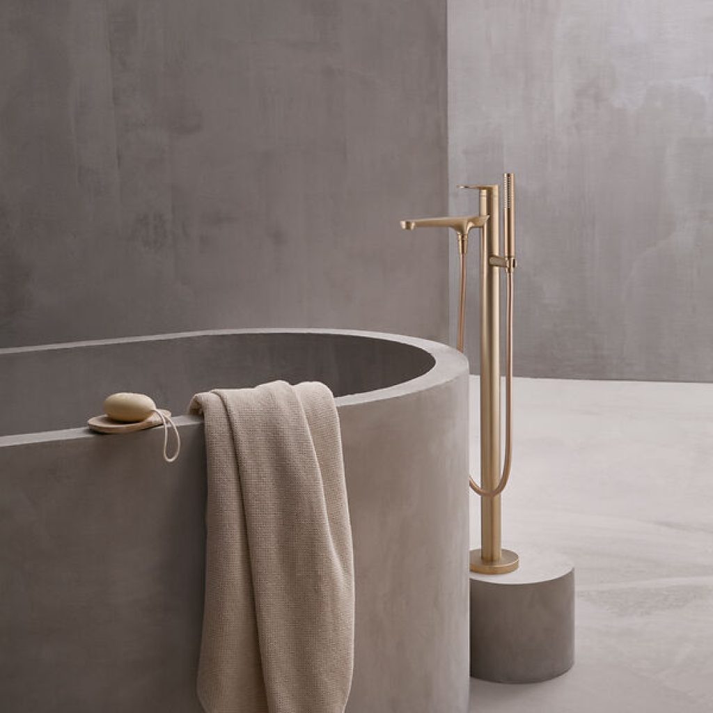 Die freistehende Badewannenarmatur hat eine starke und skulpturale Präsenz, die durch einen Sockel erhöht wird, der die klaren, vertikalen Linien verstärkt.