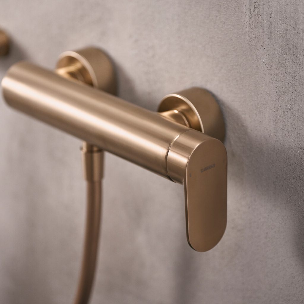 Bei den wandmontierten Bad- und Duscharmaturen sitzt der Hebel seitlich – markant in der Form und bequem in das Gesamtdesign integriert.